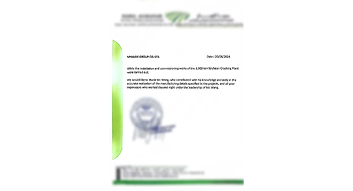 表揚信翻譯如下:“在3000噸大豆預浸車間安裝和調試工作完成之際,我們要感謝王先生,他用他的知識和技能為準確實現項目中規定的制造細節做出了貢獻,同時感謝在王先生的領導下日夜工作的所有團隊成員?!?