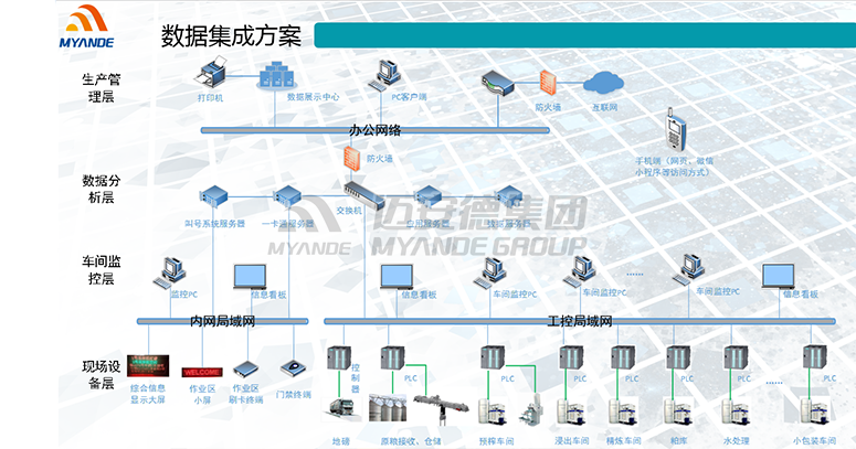 邁安德基于最新的工業(yè)4.0理念,通過工廠內(nèi)部網(wǎng)絡(luò),對各車間生產(chǎn)數(shù)據(jù)通過PLC進(jìn)行采集,與實際業(yè)務(wù)數(shù)據(jù)(采購、原料、批次、運輸、生產(chǎn)、化驗、倉儲、銷售、財務(wù)等)充分結(jié)合,運用數(shù)據(jù)整合、報表分析使客戶實現(xiàn)全廠生產(chǎn)運營過程的自動化、透明化、可視化、精益化、數(shù)據(jù)化,打造全新的智能化工廠。